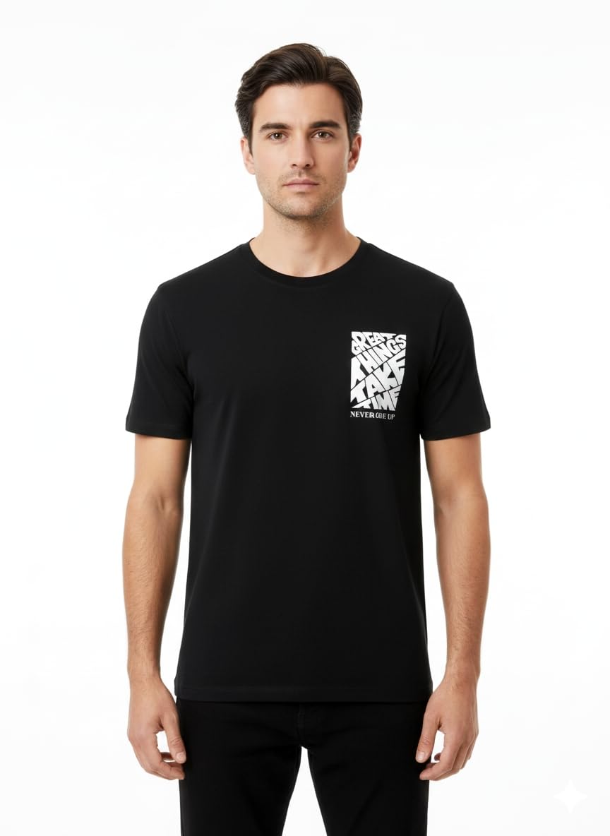 Men’s Black Soft Pure Cotton T-Shirt – “Great Things Take Time” Motivational Graphic Print – Crew Neck with Short Sleeve