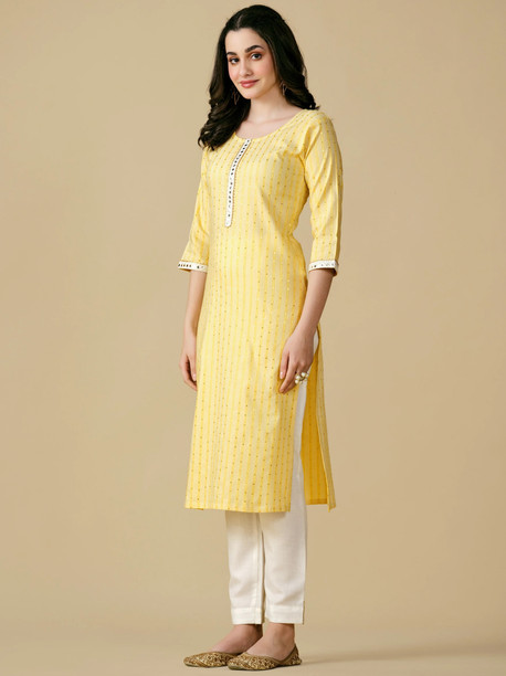 Women Embellished, Striped Cotton Blend Straight Kurta