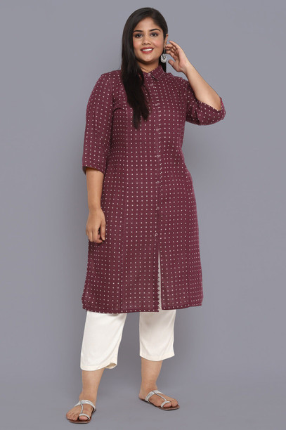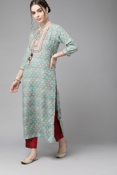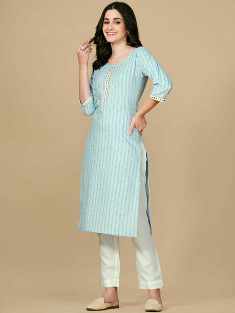 Women Embellished, Striped Cotton Blend Straight Kurta