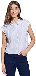 Women Blue Collar Neck Cap Sleeve Striped Shirt Blouse