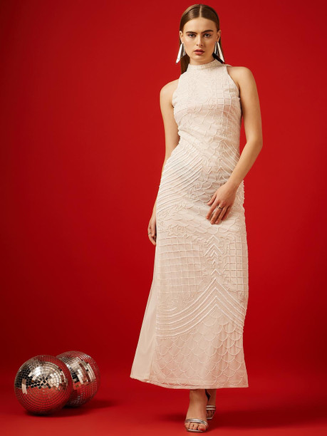 Women Fit and Flare Beige Ankle Length Dress