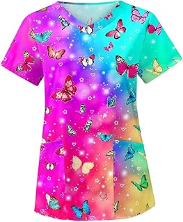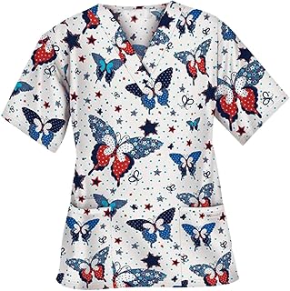 Womens V Neck Scrub Top Soft Nurse Work Uniform for Healthcare Beauty Center L White Butterfly