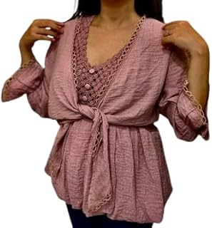 Women's Casual Cotton Net V-Neck Cotton Top with Jacket Crotio Work Bell Sleeves Top Brown
