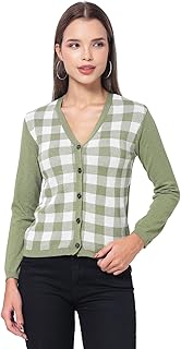 Women Full Sleeves V-Neck Checked Design Cardigan Top