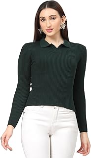 Women Full Sleeves Shirt Collar Ribbed Knitted Fitted Cotton Top